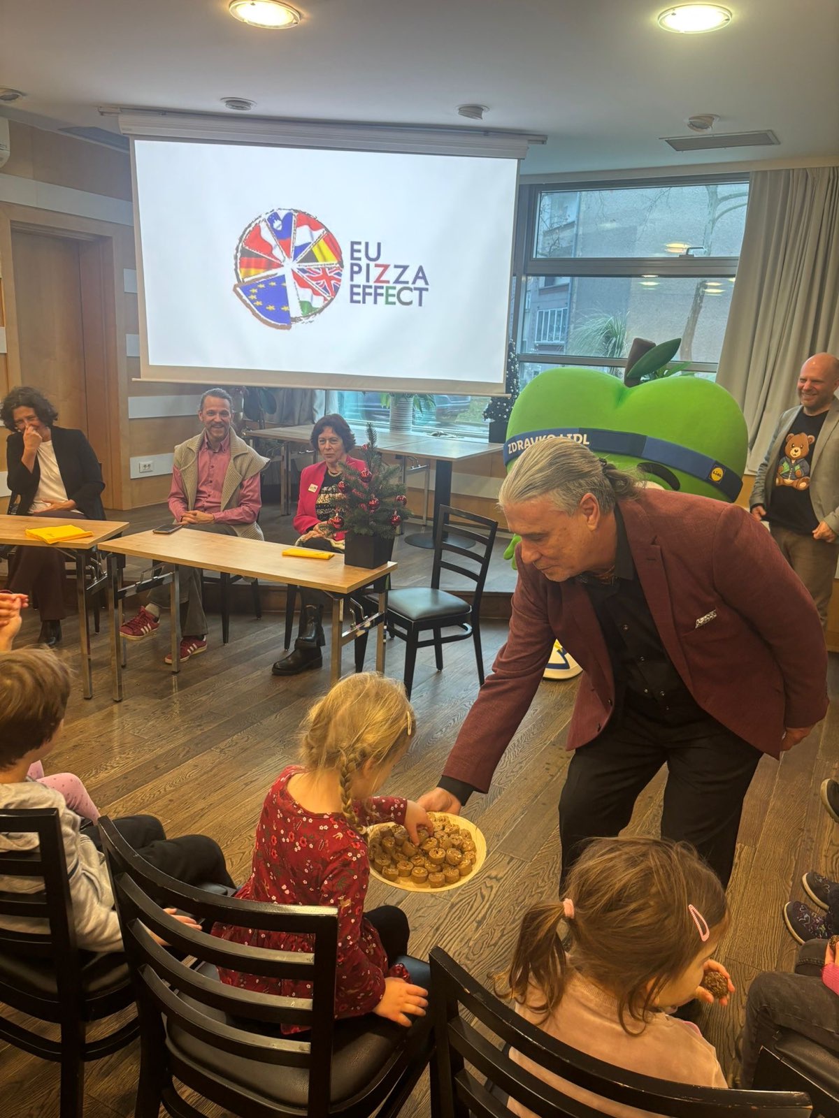 Včeraj je bil za našo skupino Aeternia 1 poseben dan. Povabljeni smo bili na dogodek, ki so ga organizirale organizacija Food for life Europe, Zdravko Lidl, Slovenska filantropija, iniciativa Paula McCartniya Meat free monday , Projekt Pizza Effect, društvo Hrana za življenje in zavod Naravno življenje ter evropski poslanci MEP. Z otroki smo bili povabljeni prav v prvo vrsto in ti so z zanimanjem poslušali, kako pomemben korak je vegetarijanski način življenja tako za človeka kot za naravo. Tudi mi smo predstavili naš vrtec in poželi velik aplavz in čestitke. Otroci so prejeli tudi lepa darila. Na koncu je zapel še Goran Karan, tudi sam vegetarijanec že vrsto let. Vrtec Najdihojca je v pionir na področju uvajanja vegetarijanske prehrane v vrtce in šole, saj jo zagotavljamo že več kot 25 let. Na začetku je bil vegetarijanski oddelek le eden, z leti pa se je povpraševanje povečalo, tako imamo sedaj kar štiri vegetarijanske oddelke za otroke, stare od 1-6 let.