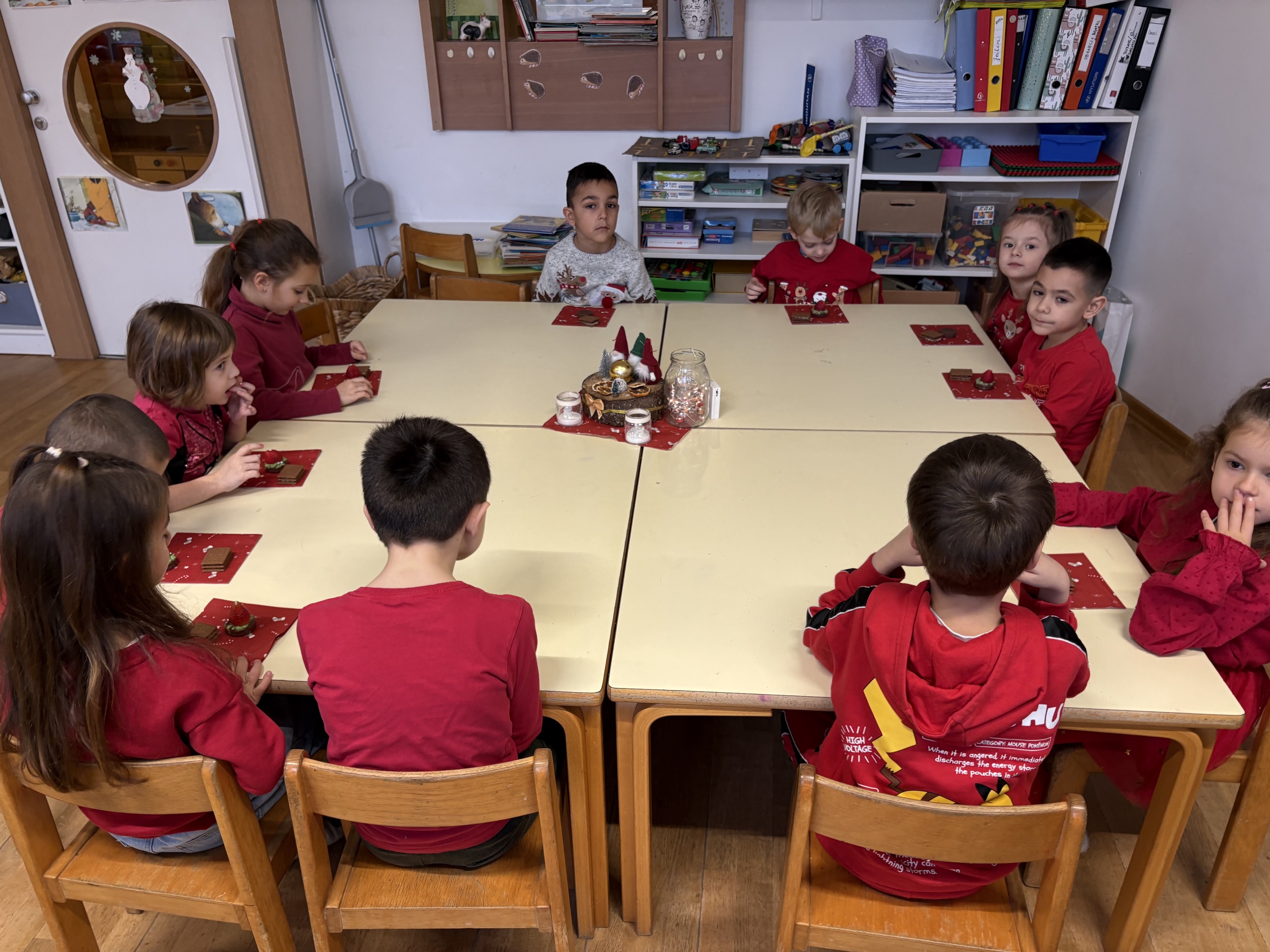 V rdečem ponedeljku je bilo v skupini Ježi Biba prav posebno in praznično. Otroci so prišli oblečeni v rdeče, kar je ustvarilo veselo, povezano in igrivo vzdušje. Skupaj smo pripravili čajanko, kjer so otroci ob prijetnem druženju okušali čaj in slastne grižljaje z jagodami, ki so jih z zanimanjem in navdušenjem opazovali ter pokušali.