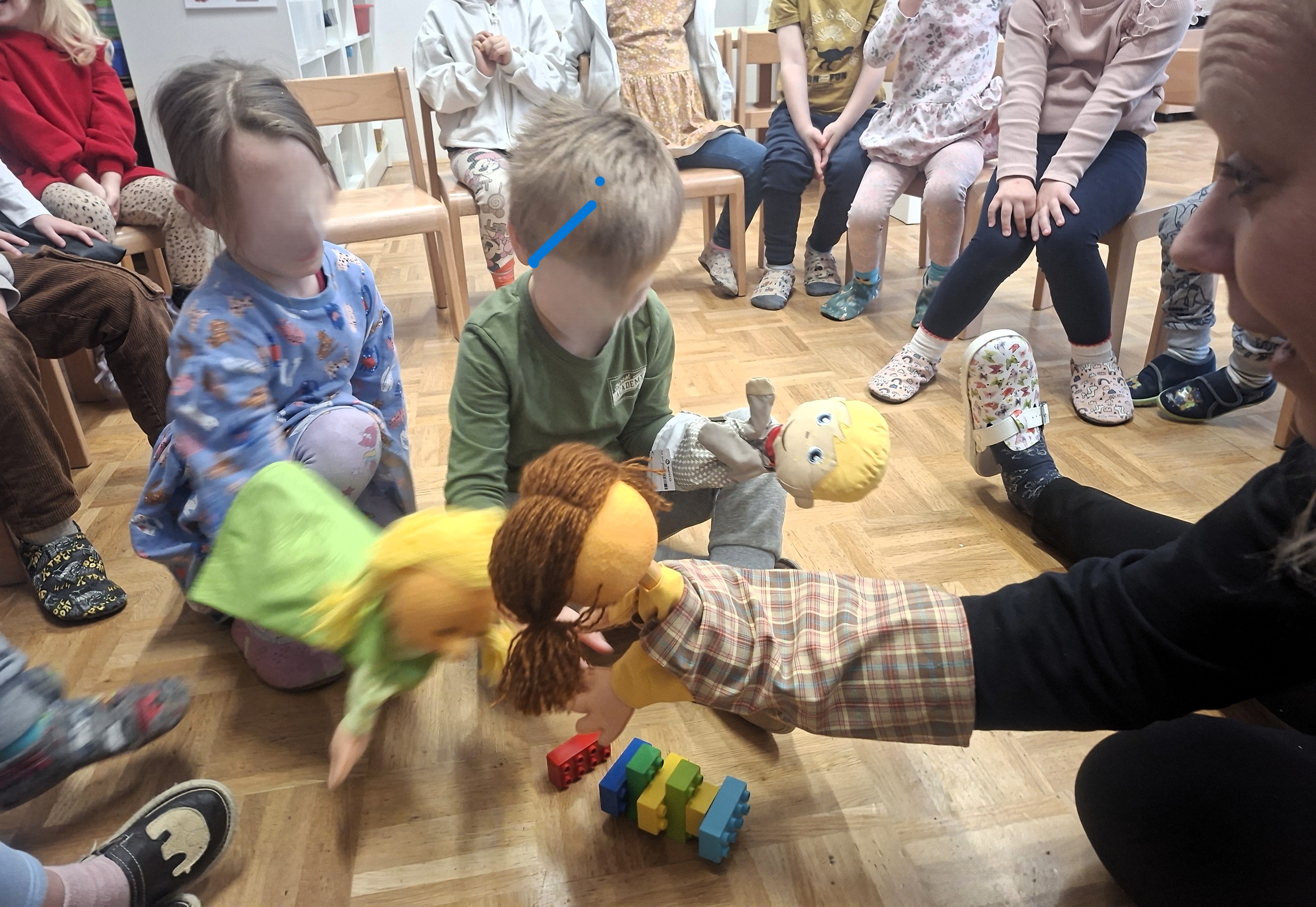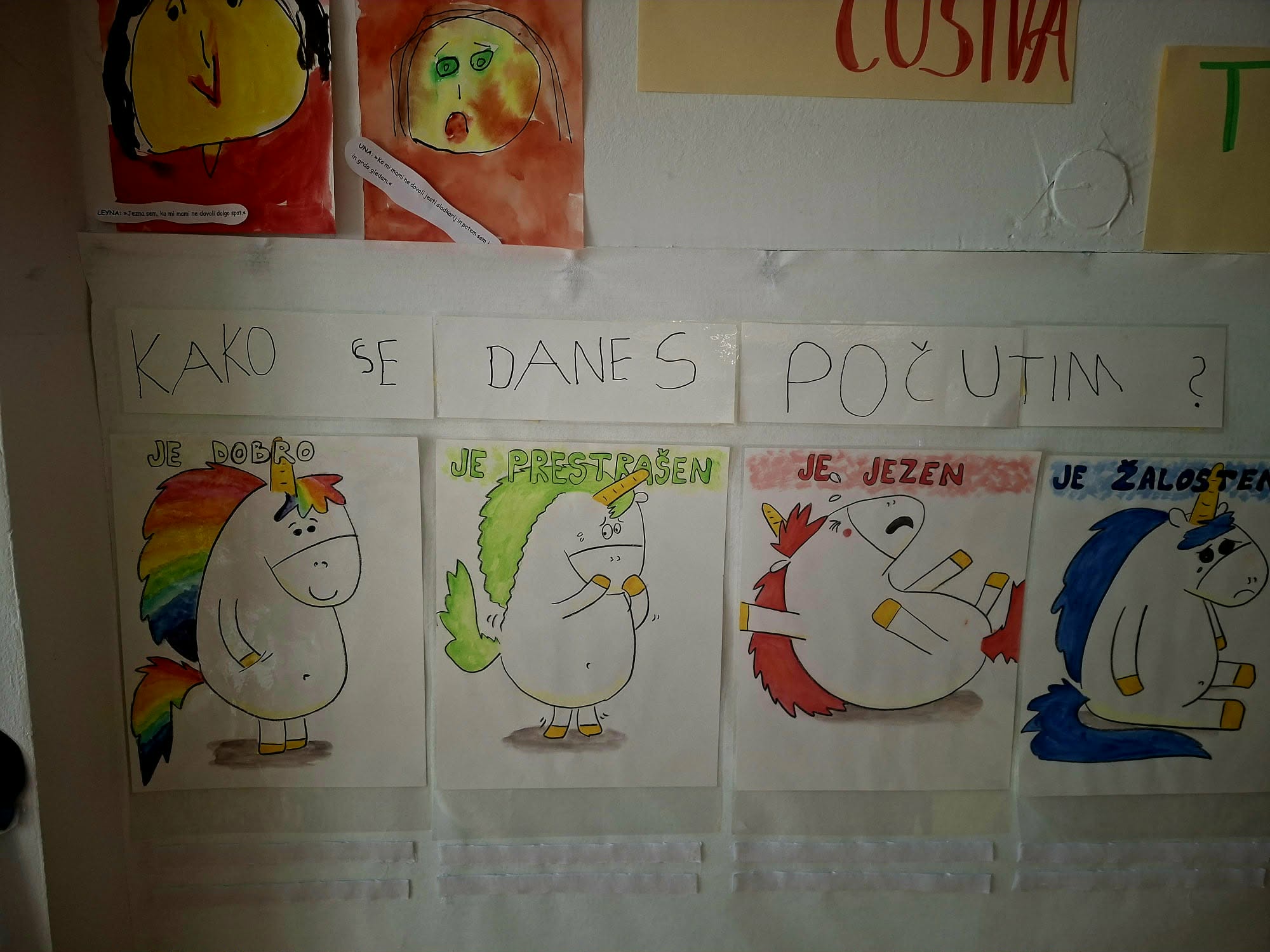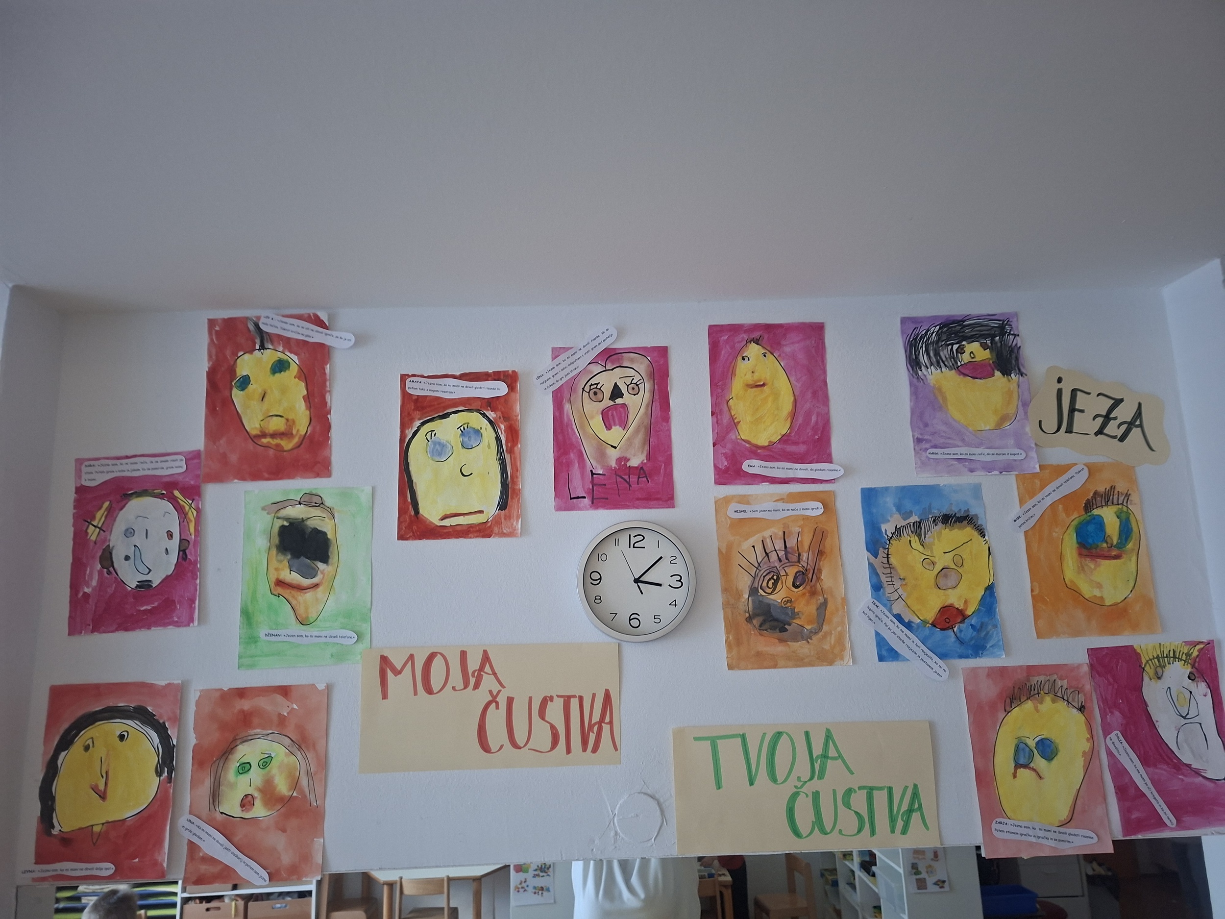 V mesecu januarju smo ribice ob prebiranju zgodbic spoznavale in prepoznavale čustva. Spomočjo lutke so otroci poskušali reševati konfliktne situacije ter spoznavali čustva jeza in žalost. Otroci so vsakodnevno pripovedovali o svojih občutkih ter ob tem prilepili svoj znak pod ustrezno sliko čusteva. Ob slikanici KAKO PREMAGAMO JEZO smo podrobneje spoznali čustvo JEZA ter načine ustreznega premagovanja le te. Otroci so svoje jezne obraze tudi likovno upodobili, ter ob tem povedali kdaj in zakaj so oni jezni.