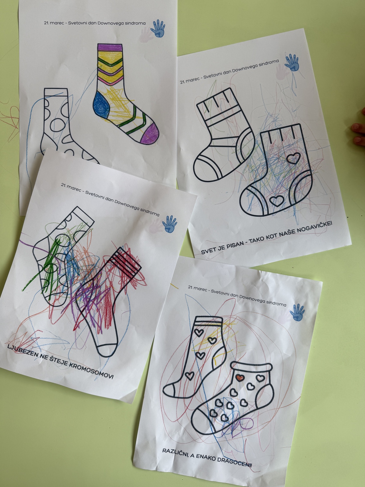 V soboto, 21. 3. 2026, obeležujemo svetovni dan Downovega sindroma. V Zmajčkih smo zato danes obuli različne nogavičke ter barvali pobarvanke s pomembnimi sporočili.
