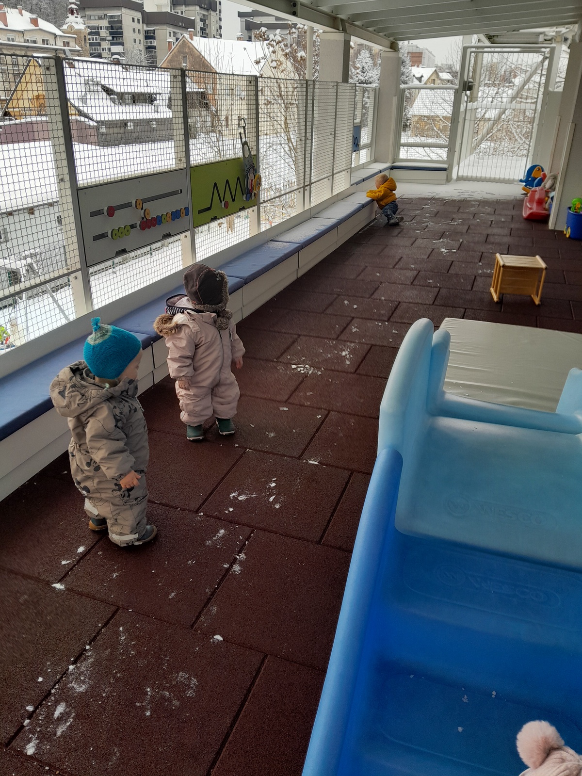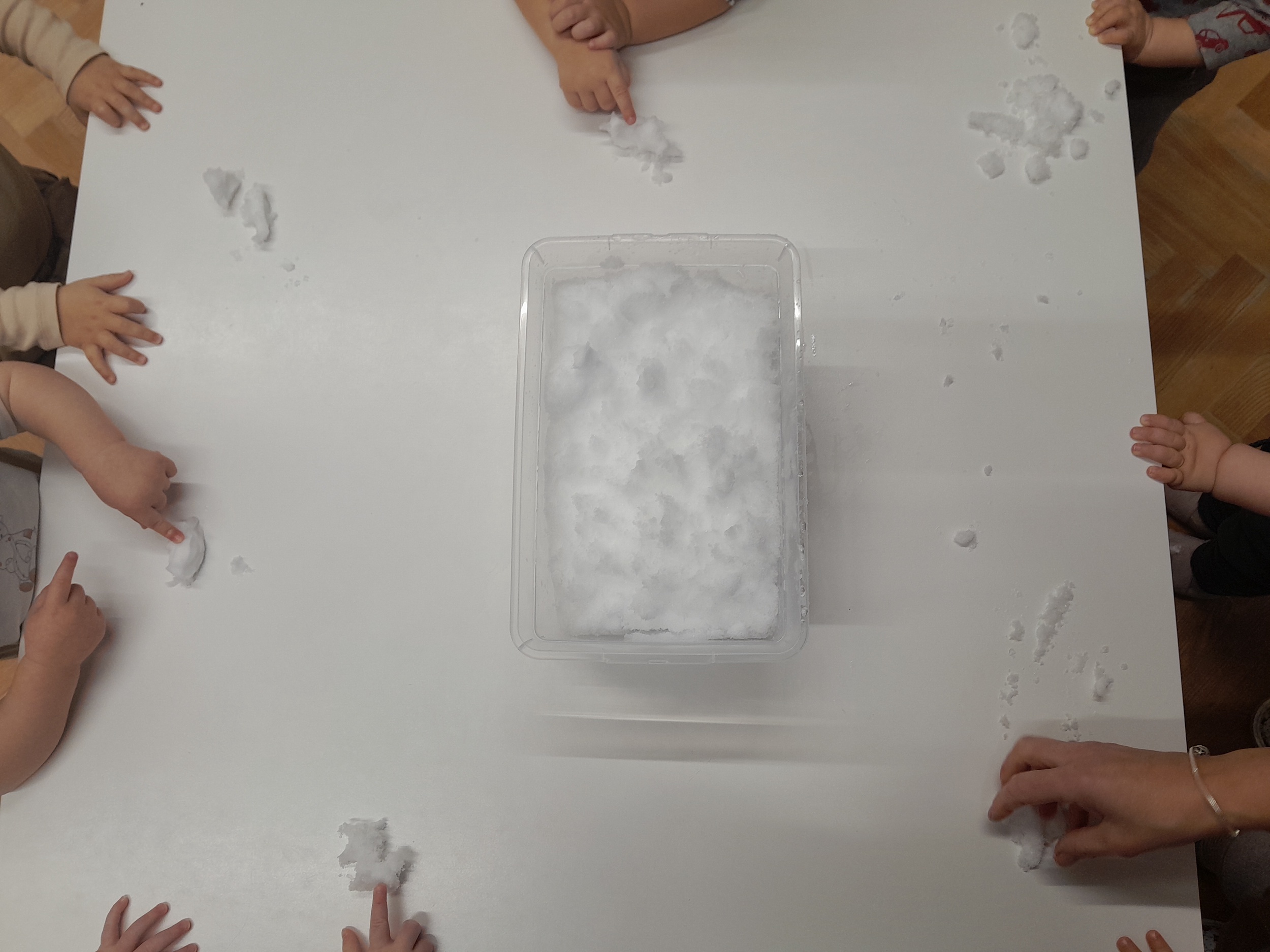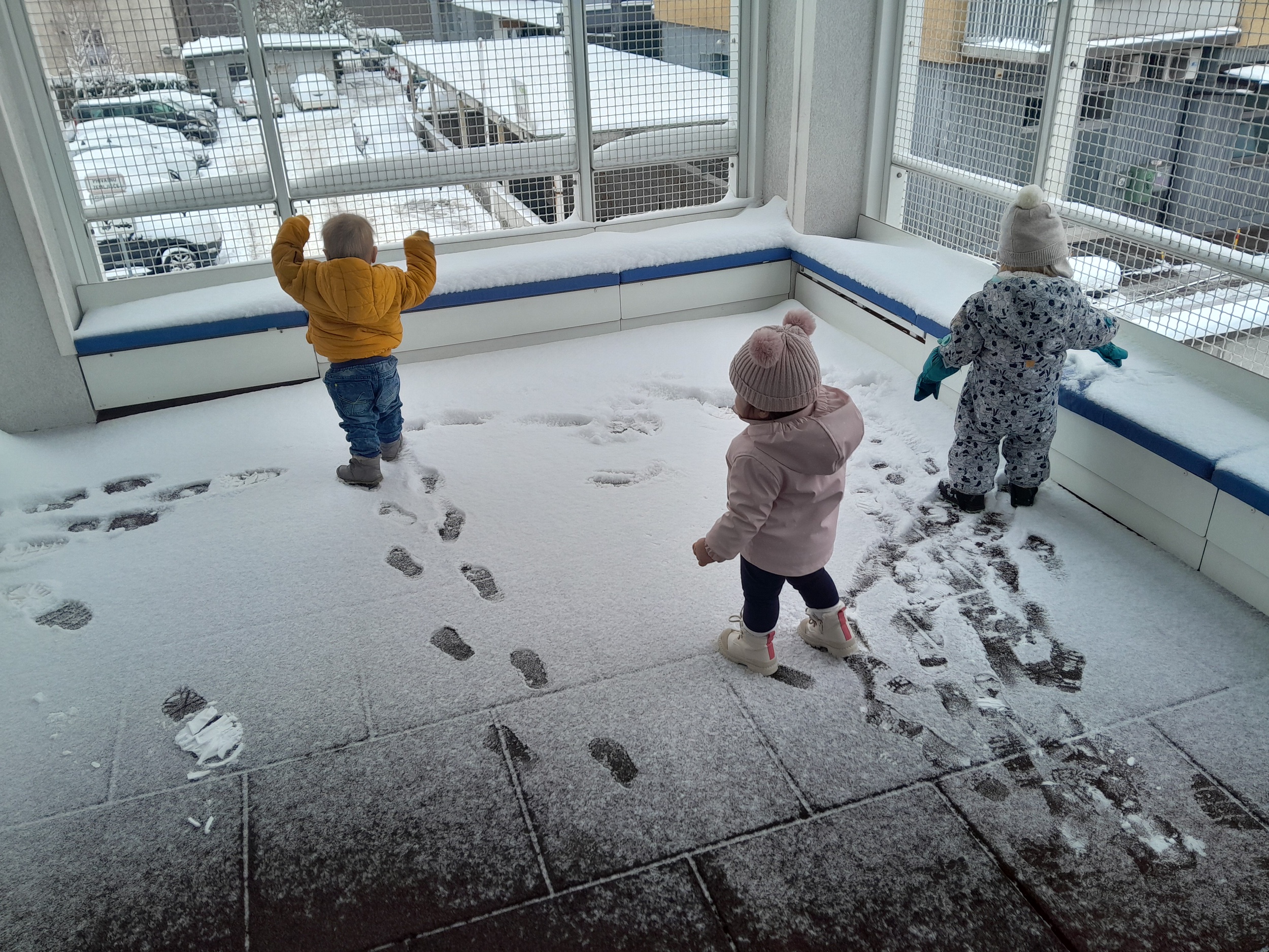 Pa smo le dočakali prvi letošnji sneg. Nekateri otroci so ga bili zelo veseli, spet drugi malo manj. Nekateri so z navdušenjem prijemali belo čudo, ga opazovali in raziskovali, drugi pa so se ga sprva raje izogibali.