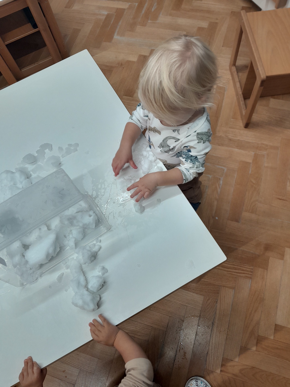 Sneg smo spoznavali v igralnici, kjer smo ga tipali, opazovali in se o njem pogovarjali, prav tako pa tudi zunaj, na naši terasi. Otroci so ob tem pridobivali nove izkušnje, razvijali čute in na svoj način doživljali zimsko radost