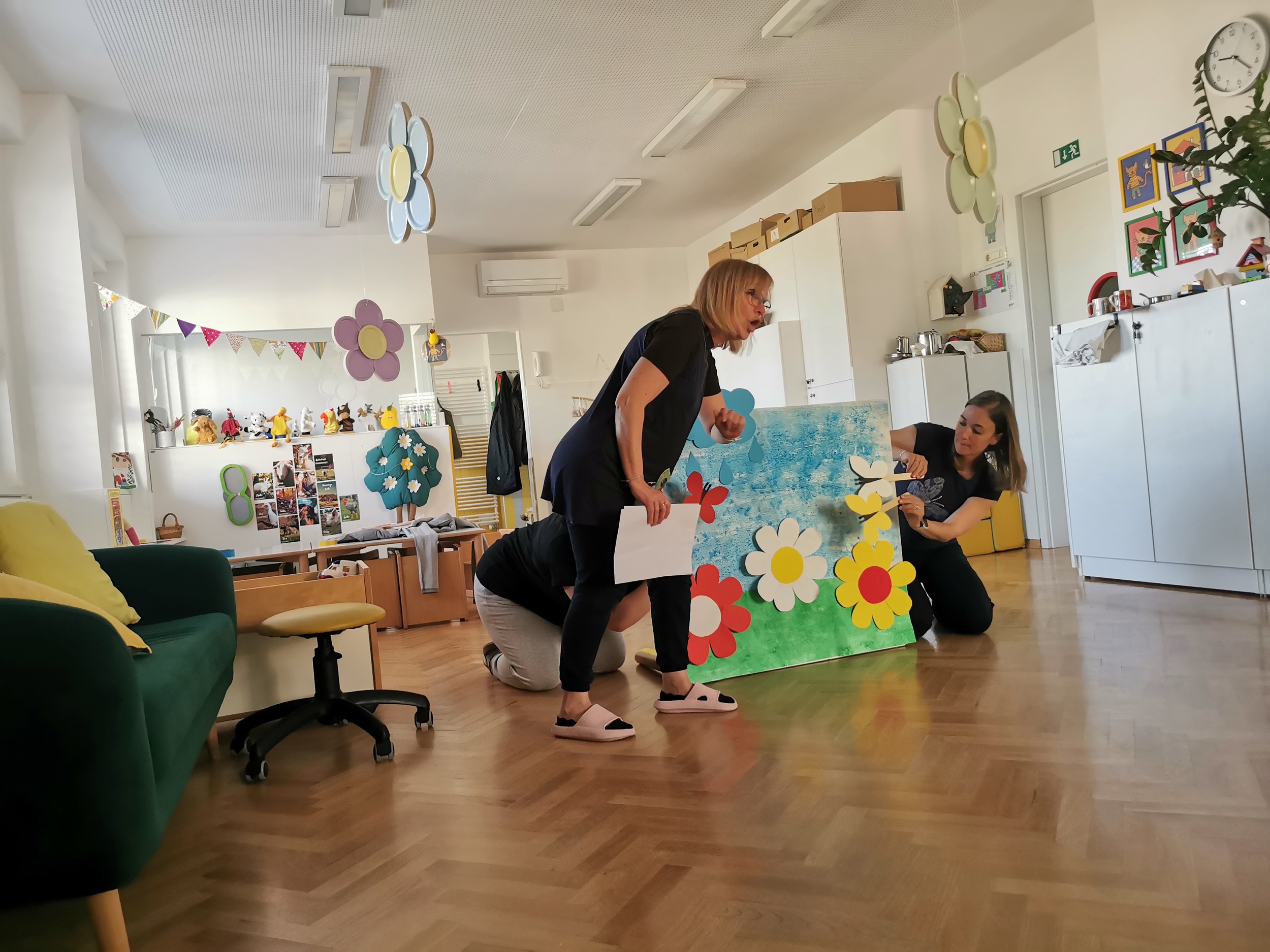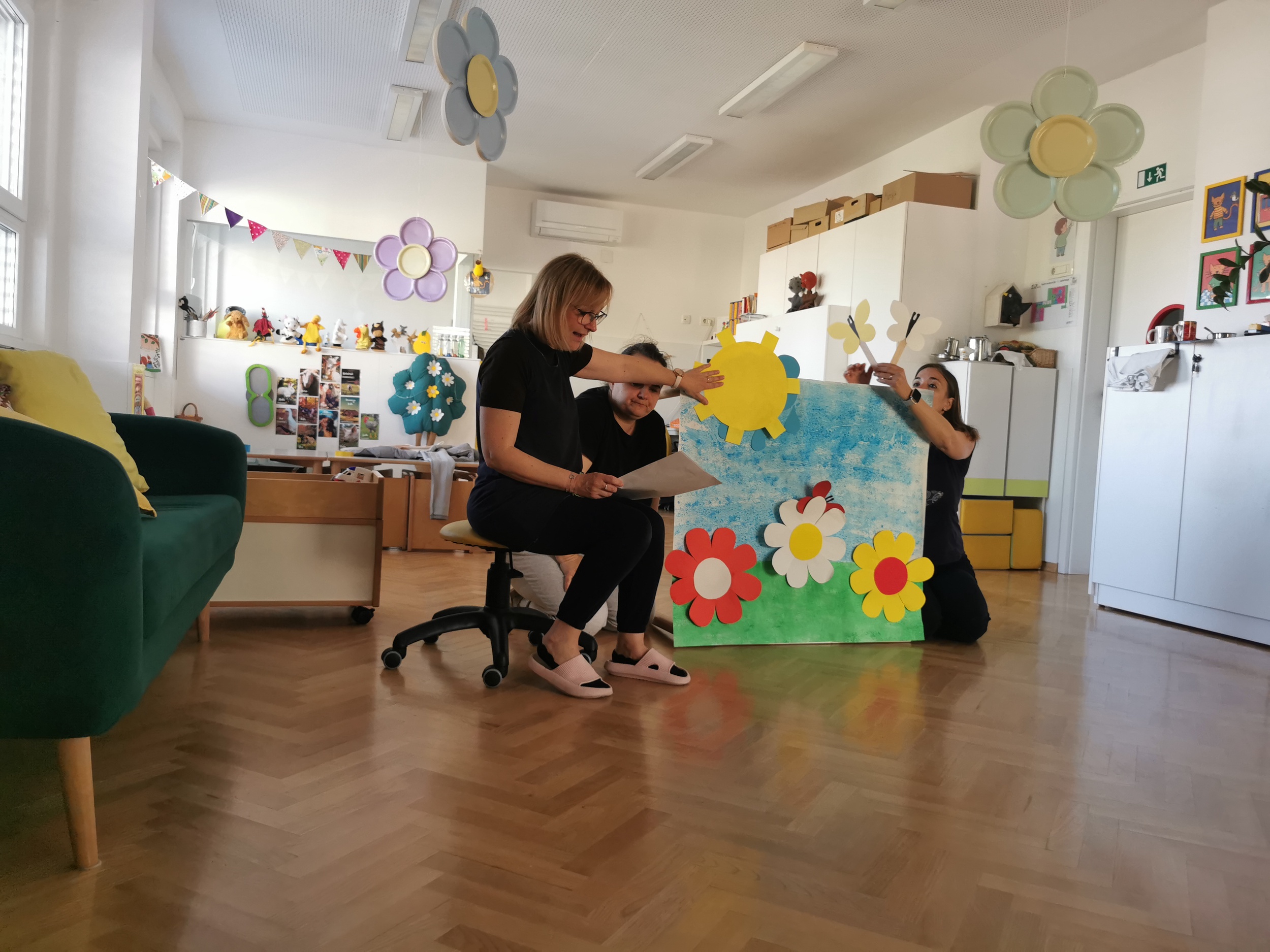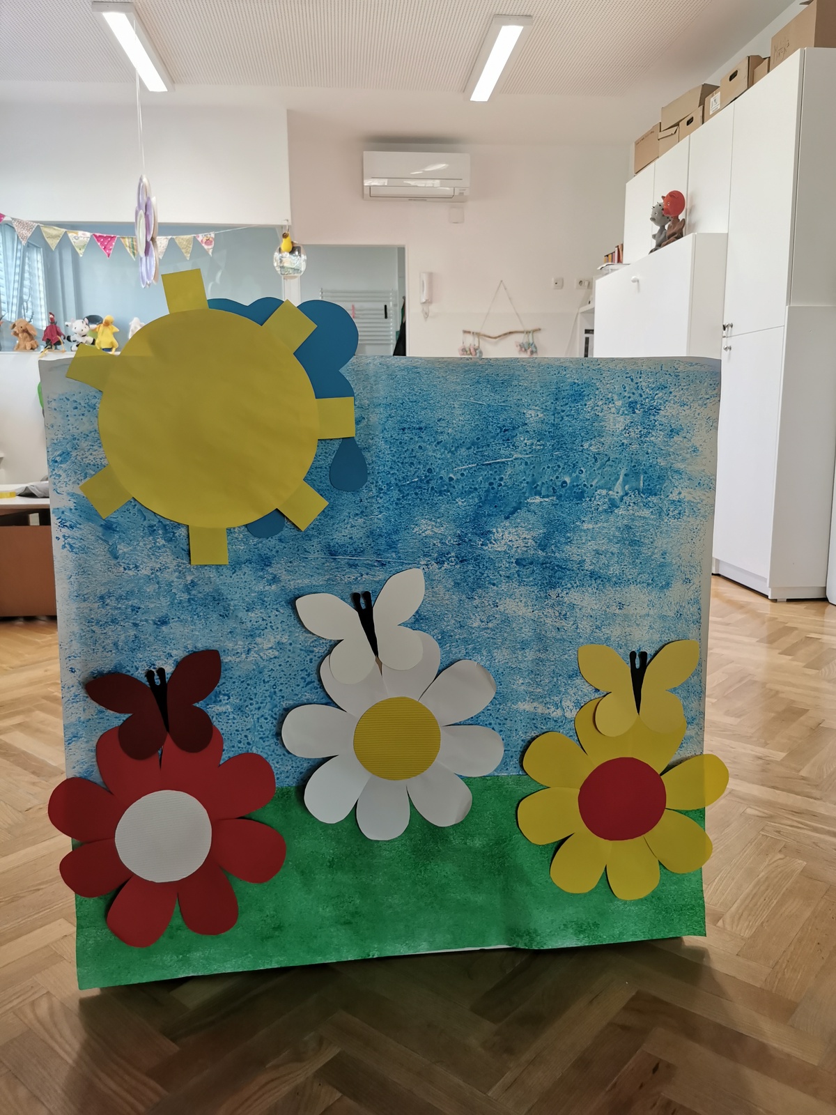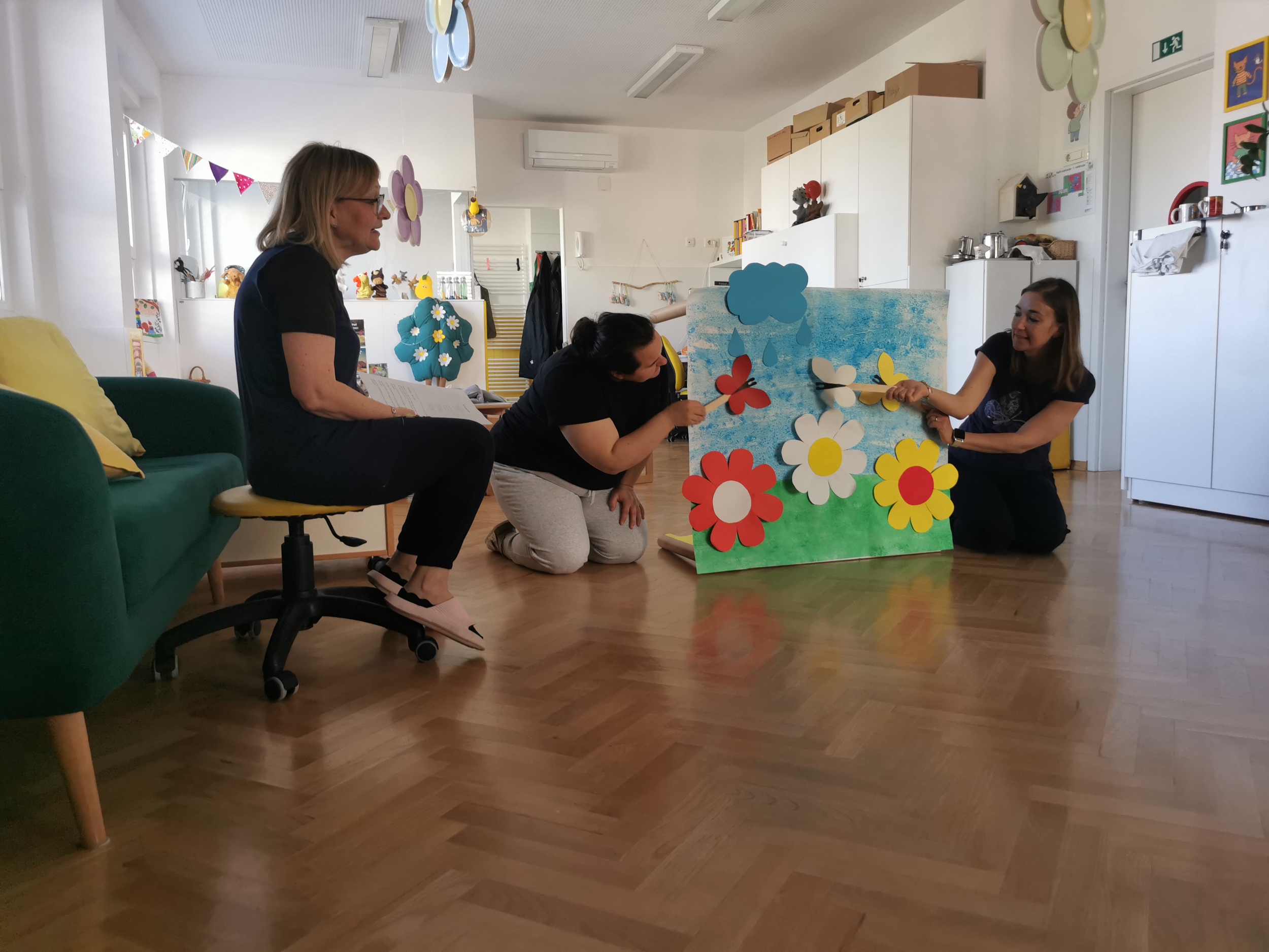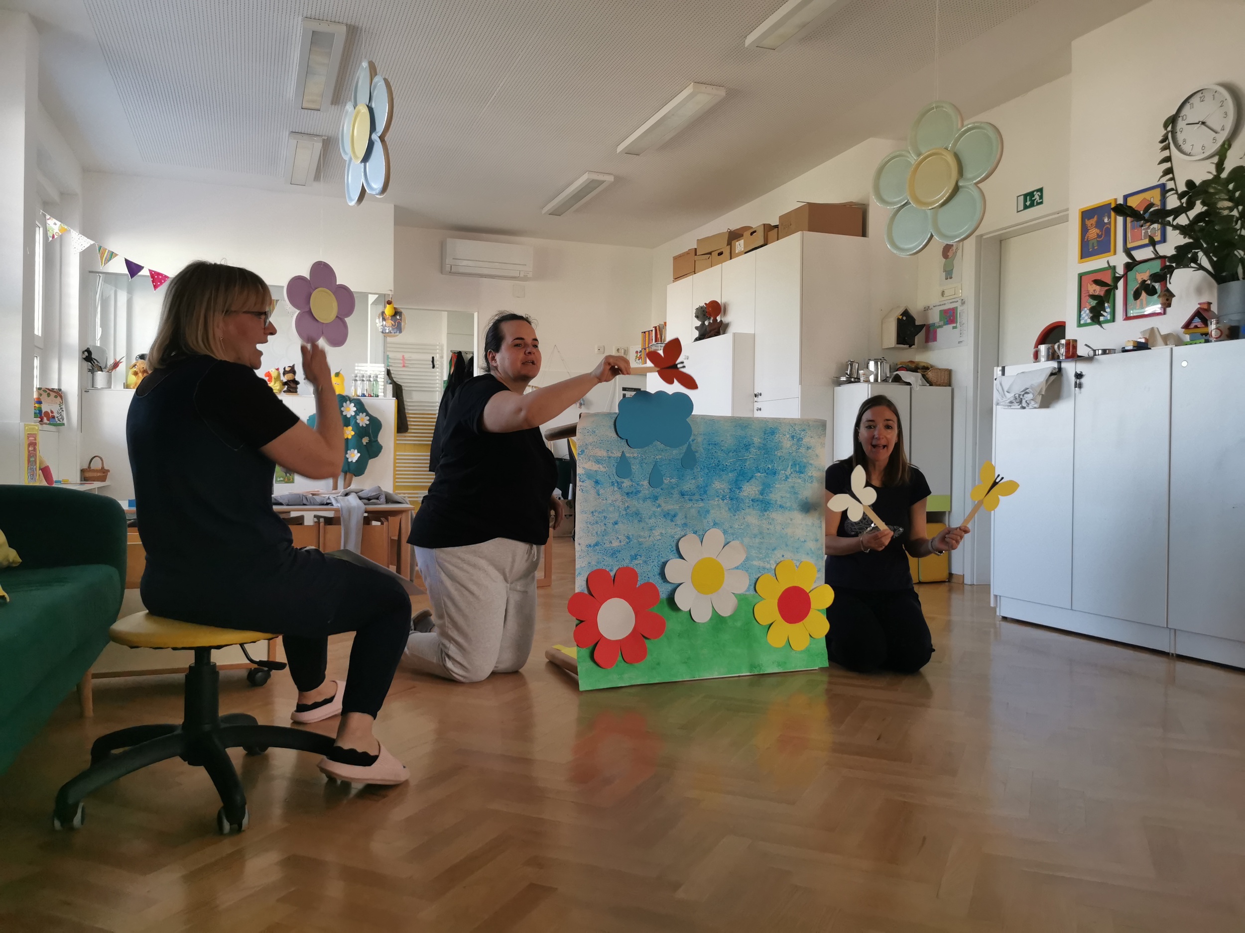 Pred prvomajskimi prazniki smo strokovne delavke na jasličnem oddelku pripravile dramatizacijo zgodbe Trije metulji. Po predstavi smo skupaj zapeli še nekaj otroških pesmic.