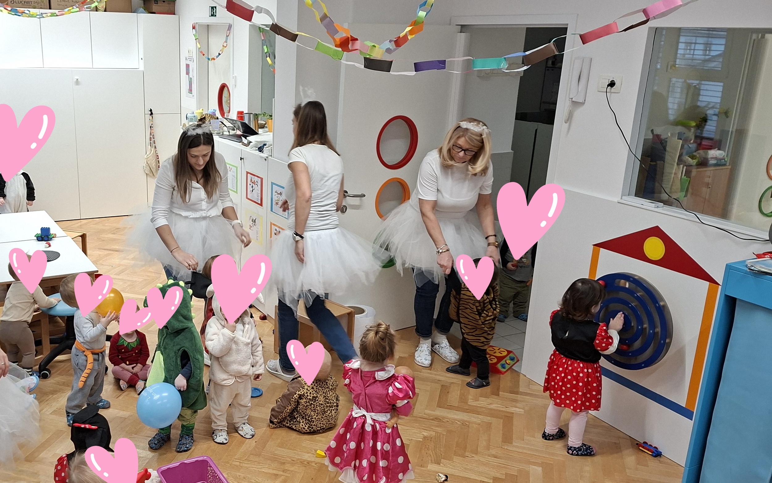 Najmlajši so z zanimanjem opazovali kostume drug drugega, se zavrteli in veselo zaplesali. S plesom smo odganjali zimo in vabili pomlad. Po sladkem krofu smo si nabrali novo energijo za igro in veselo rajanje.