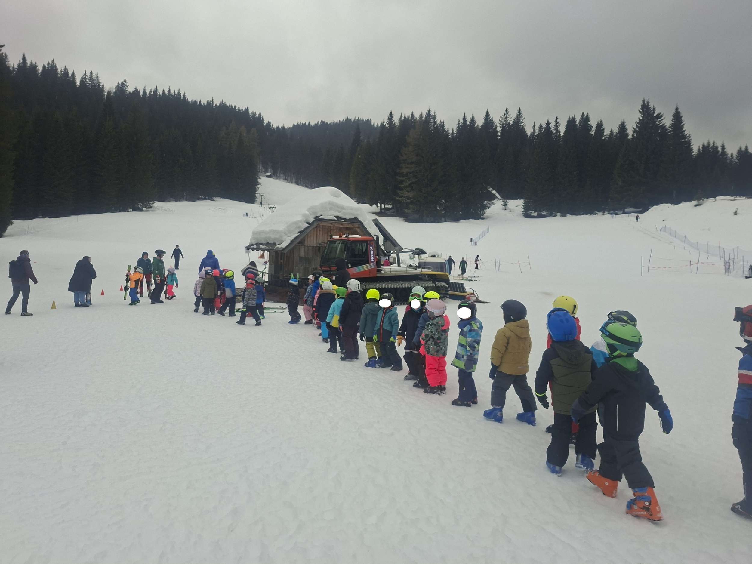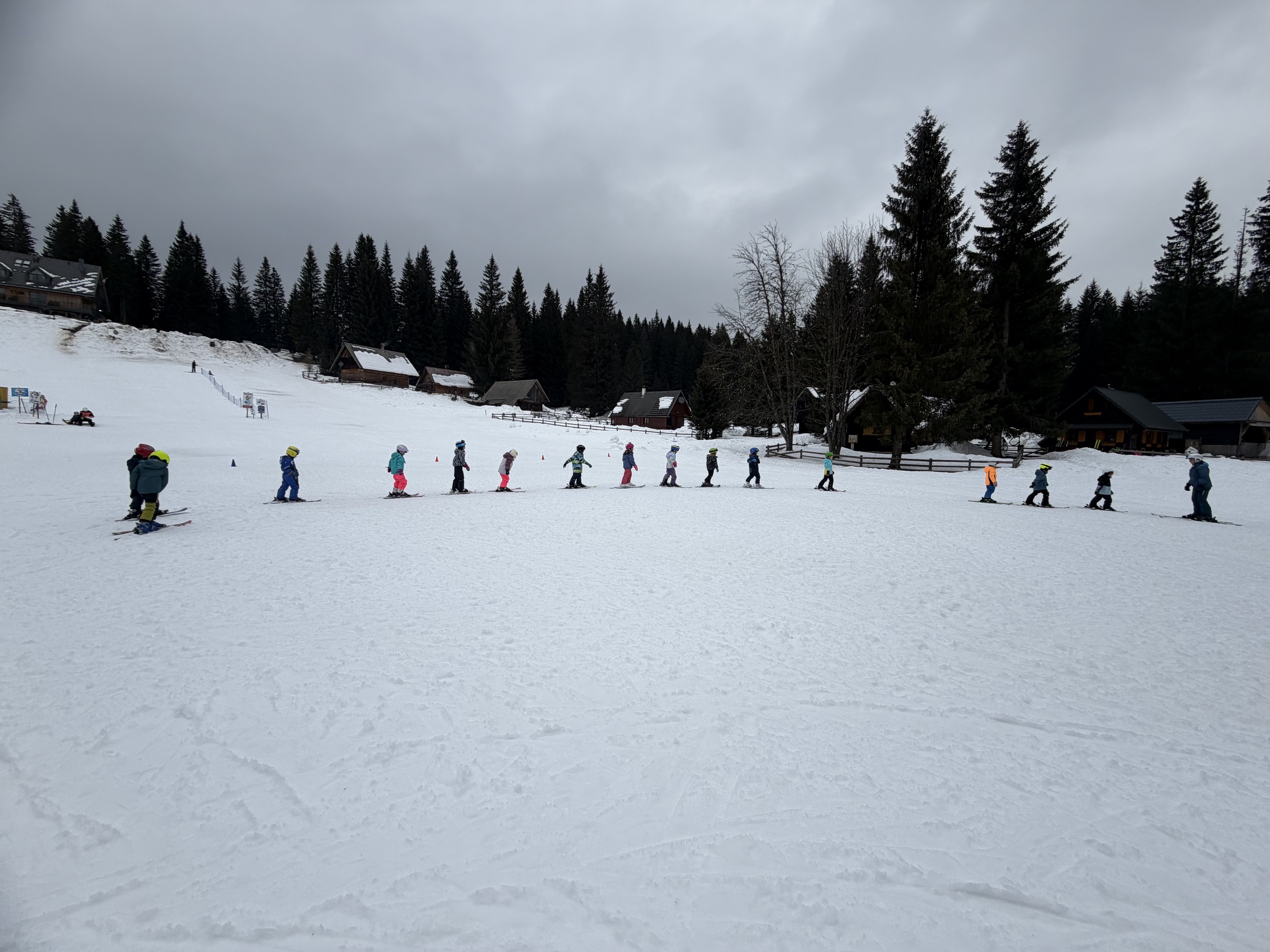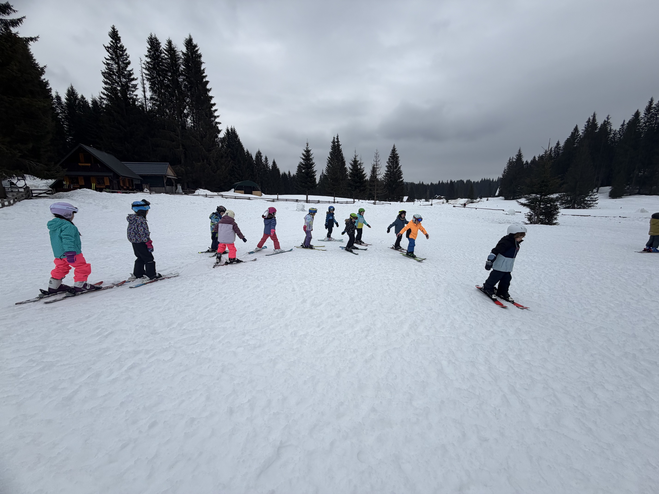 Z avtobusom smo varno prispeli pred Hotel Jelka, kjer smo se namestili v sobe. Kosilo nam je dalo moč za prve zavoje na belih strminah. Otroci so z navdušenjem stopili na smuči in se pogumno preizkusili v prvih vijugah – prav vsem je šlo odlično! Vmes smo se okrepčali še s sadjem.